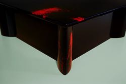 Der moderne Tisch ist hochglanz lackiert, schwarz mit roten Farbakzenten (Kalligraphie-Technik). Der Tip-on Schubkasten lässt sich durch leichten Druck auf einer Seite öffnen. Er umfasst beinahe die komplette Tischgröße.